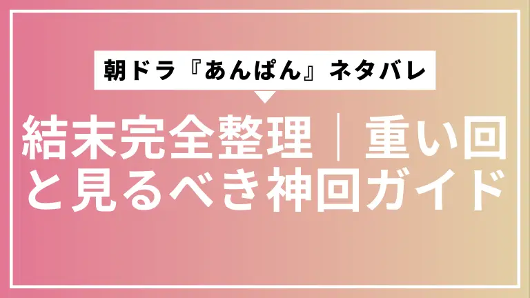 忙しくても、朝ドラ『あんぱん』の大事なネタバレと結末だけ、先に知っておきたい。 そんなふうに感じている読者に向けて、この記事では朝ドラ『あんぱん』の全体の流れ・重い展開・最終回の意味を、できるだけコンパクトに整理します。 どこで戦争や死別などメンタルに来る山場が来るのか 逆に、“ここだけ観ればOK”な神回がどこなのか 「全部は観られないけれど、話題にはついていきたい」という読者が、自分に合う視聴モ […]
