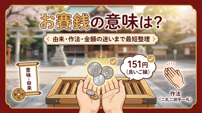 年末年始や旅行先でお参りするとき、「お賽銭って、結局なに?」「151円って意味ある?」と急に気になって、財布の小銭を見つめたことありませんか。 結論から言うと、**お賽銭は“願いを買うお金”ではなく、神さまへの感謝や敬意を形にした“浄財(きれいなお金)”**として捧げるものです。金額に絶対の正解はありません。 お賽銭の意味は「感謝を形にする浄財」 神社本庁は、お賽銭について「浄財」という言い方をし […]