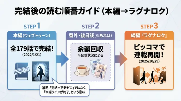 - 続編(ラグナロク):本編の“後”を別作品として追うイメージ。ピッコマ側で再開告知あり